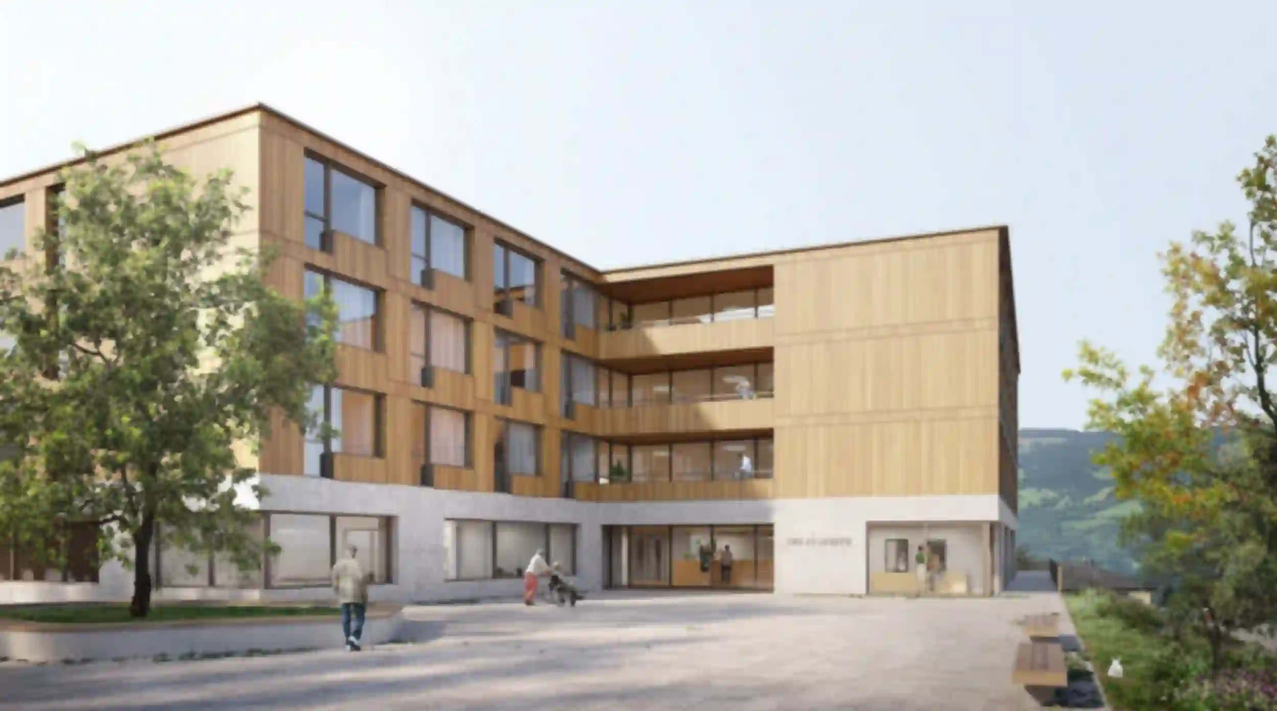 Der Neubau des Altenheims erfolgt im Zuge einer gesamthaften Betrachtung der Pflege- und Betreuungsangebote für Seniorinnen und Senioren in der Region Gruyère. Als eines von vier Projekten wird der Standort neu entwickelt und soll zukünftig 87 Pflegeplätze bereitstellen. Der vorgeschlagene Neubau bietet dabei eine kompakte Lösung auf dem topografisch stark abfallenden Gelände und bietet mit der neu geschaffenen Terrasse im Osten einen beeindruckenden Blick über das Tal auf die Alpen.