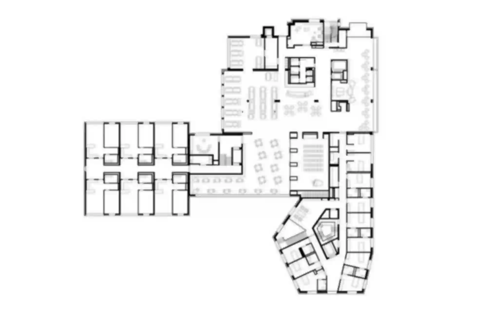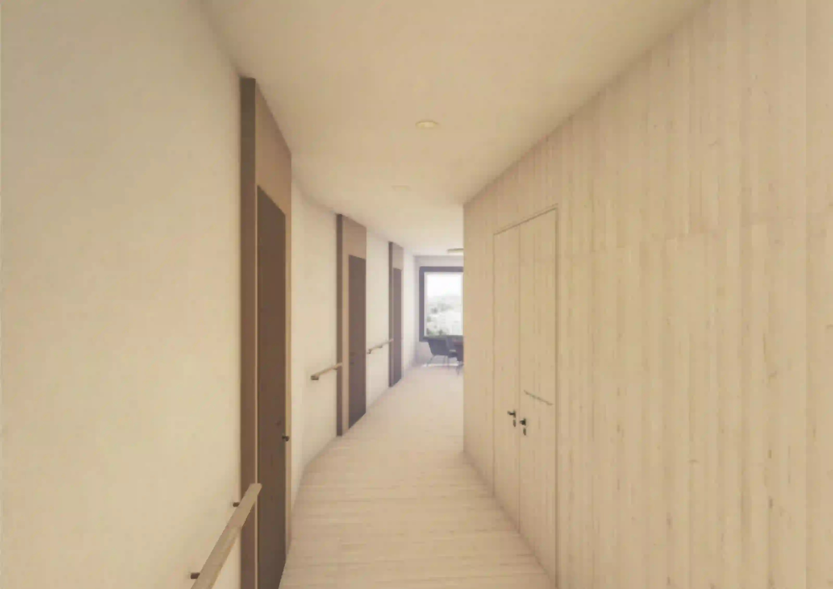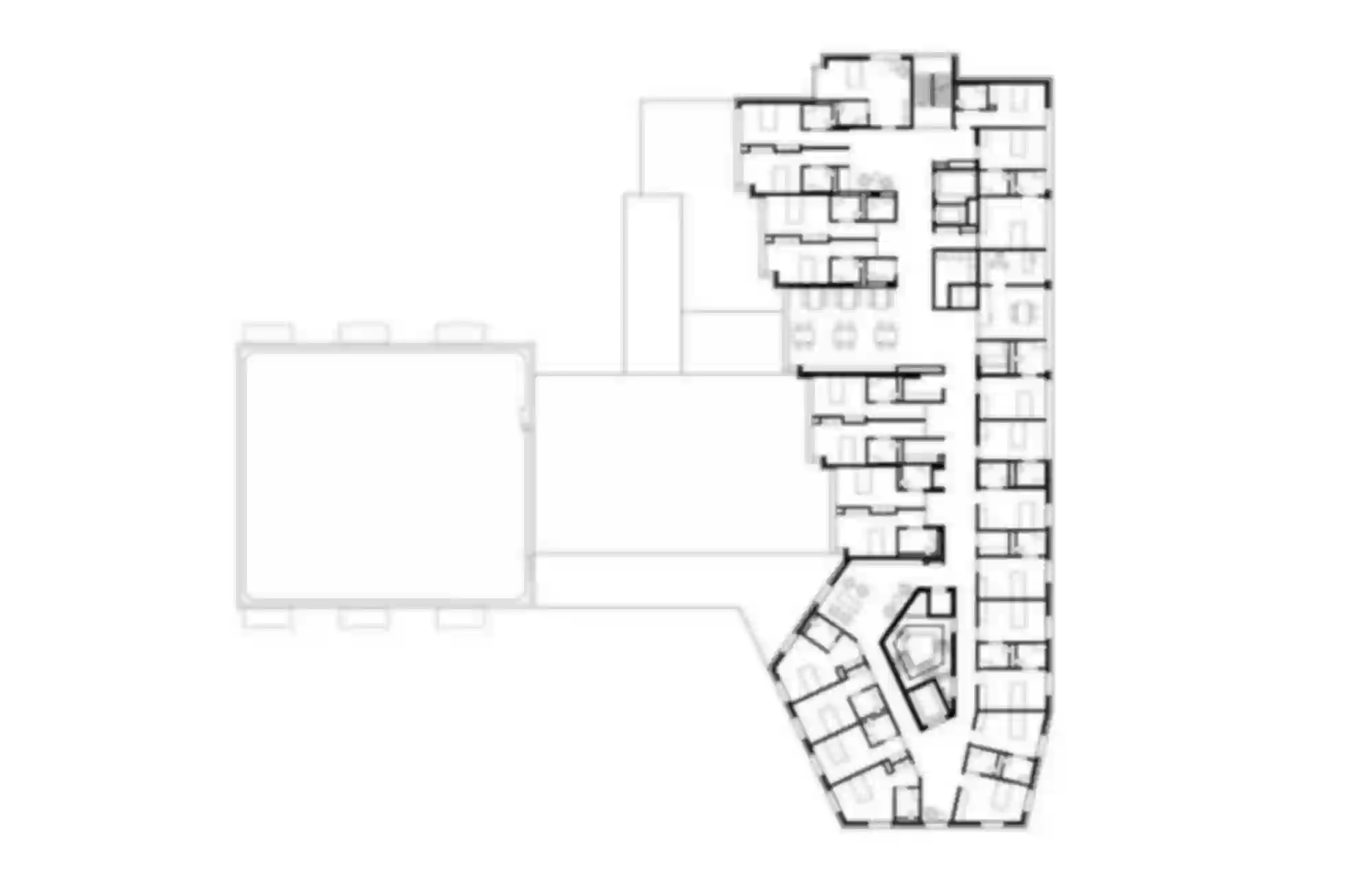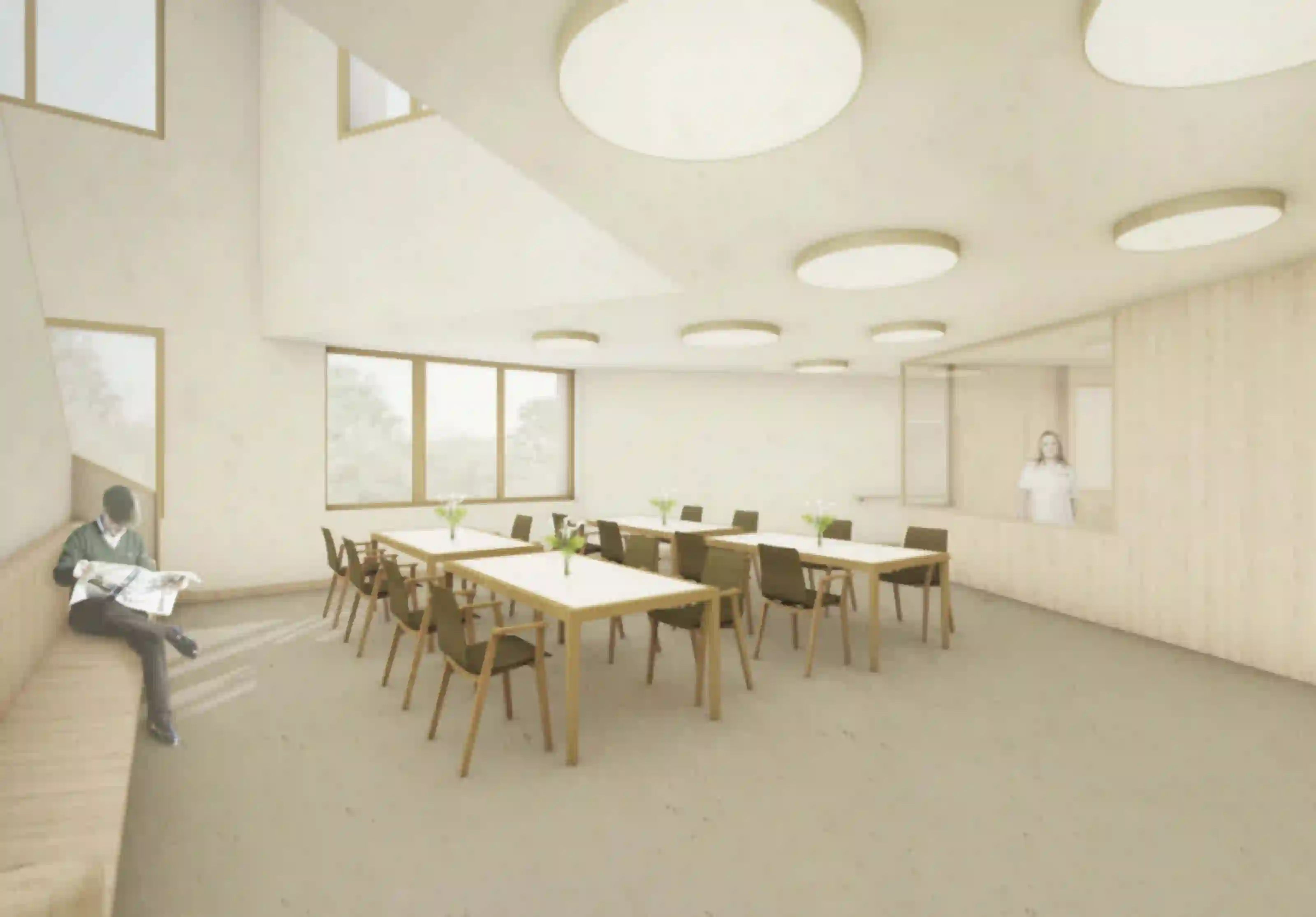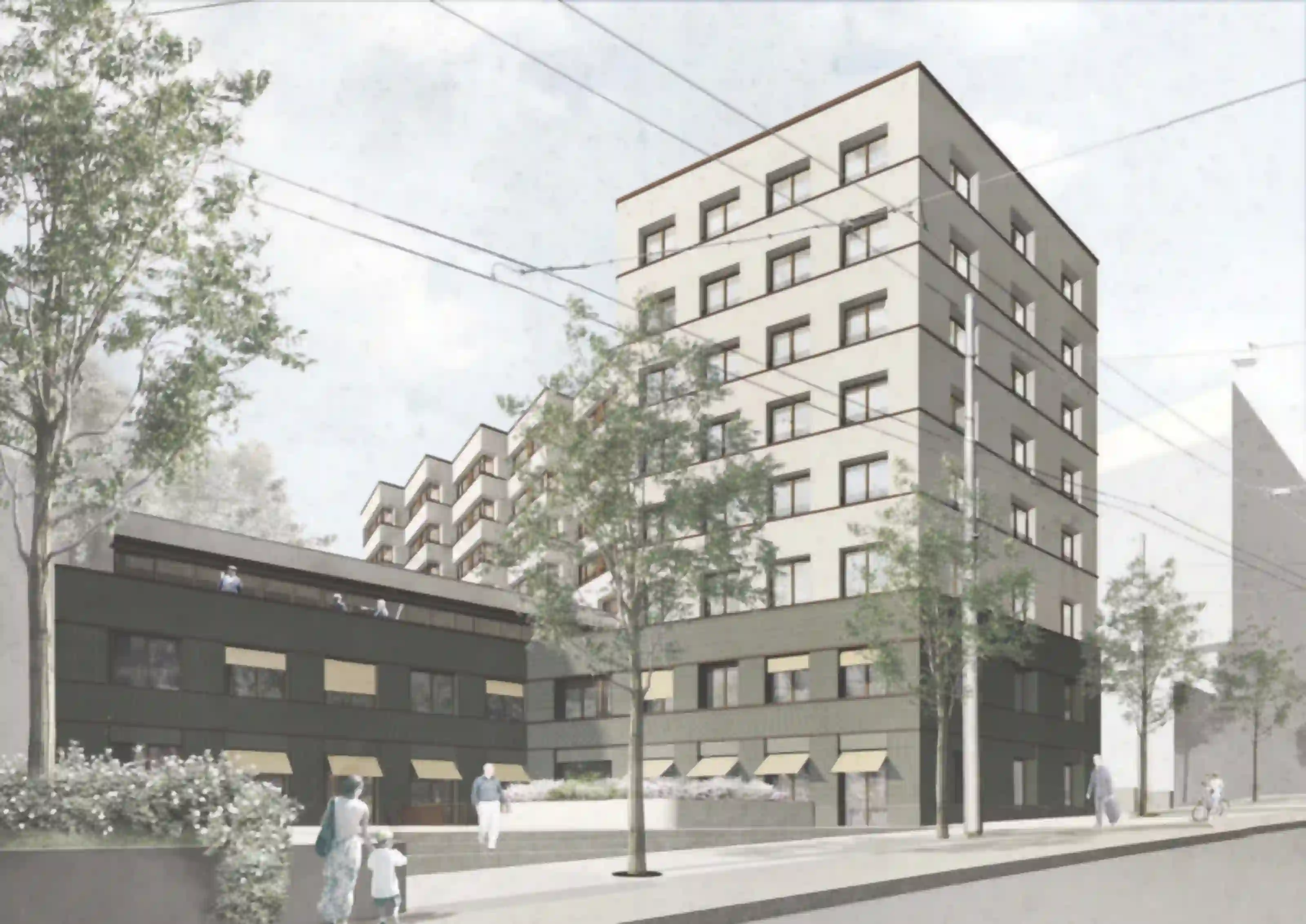Das Altersheim liegt im Westen von Lausanne zwischen der Avenue de Morges im Süden und dem ruhiger gelegenen Chemin de Renens im Norden . Das Grundstück ist stark topographisch geprägt und fällt nach Süden um zwei Geschosse ab. Die Erweiterung erfolgt direkt an der stark befahrenen Avenue de Morges, wo ein polygonaler Kopfbau als achtgeschossiger Turm einen signifikanten Auftakt bildet und seitlich einen kleinen Quartiersplatz formuliert. Während die drei unteren Ebenen einen Sockel bilden und vor allem übergeordnete Nutzungen beherbergen, dienen die fünf Obergeschosse den Wohngruppen. Die Baustelle wurde in zwei Phasen realisiert: zunächst wurde der Neubau bei laufendem Betrieb zwischen zwei Bestandsbauten gesetzt, nach dem Umzug der 87 Bewohner in den Neubau konnten der Bestand und die Aussenanlagen saniert werden. Zusammen mit dem Neubau verbinden sich die Grundrisse jetzt zu luftigeren Einheiten, die sich entlang einer linearen Erschliessung immer wieder zum Aussenraum hin öffnen und Orte der Begegnung und des Austauschs für die nun 145 Bewohner schaffen.