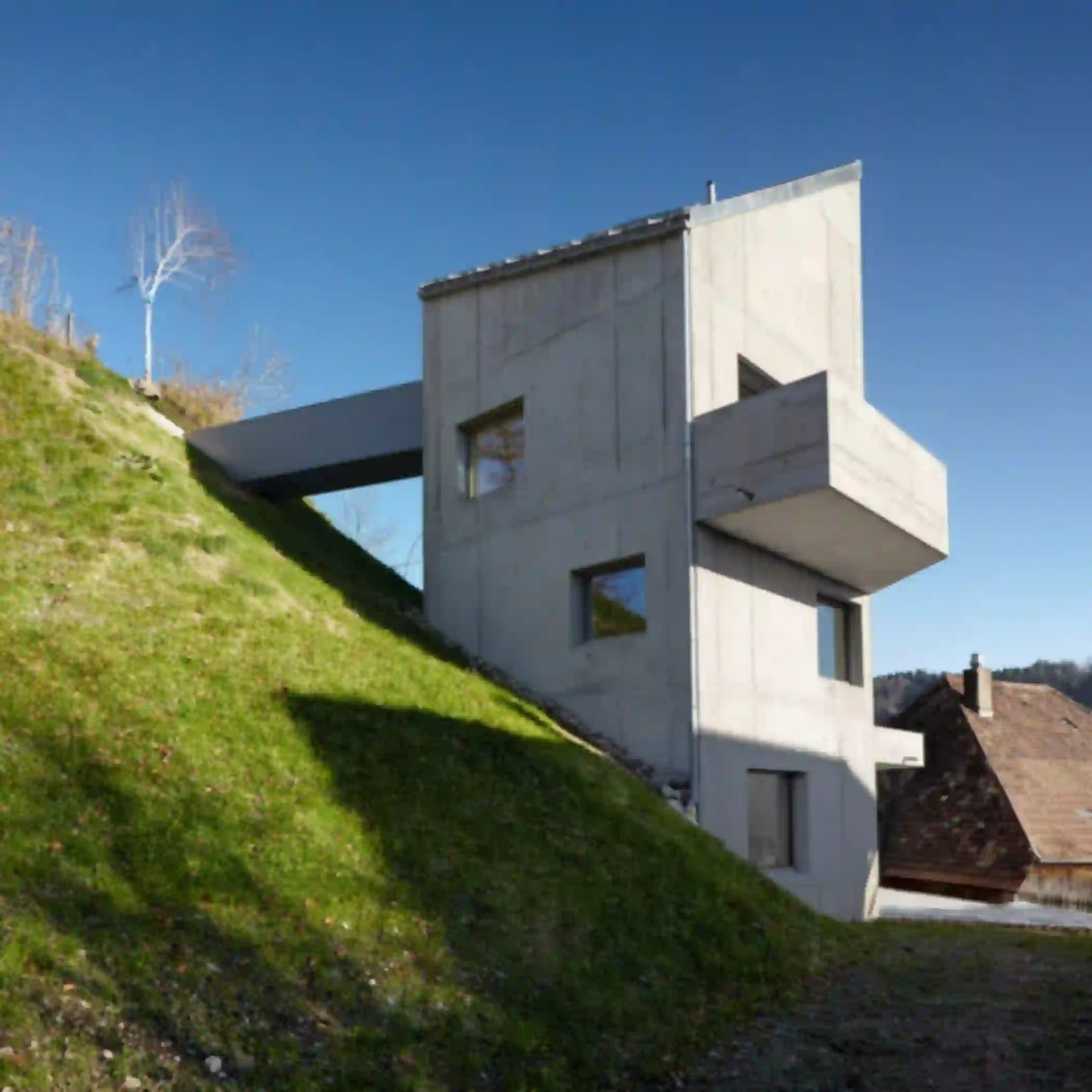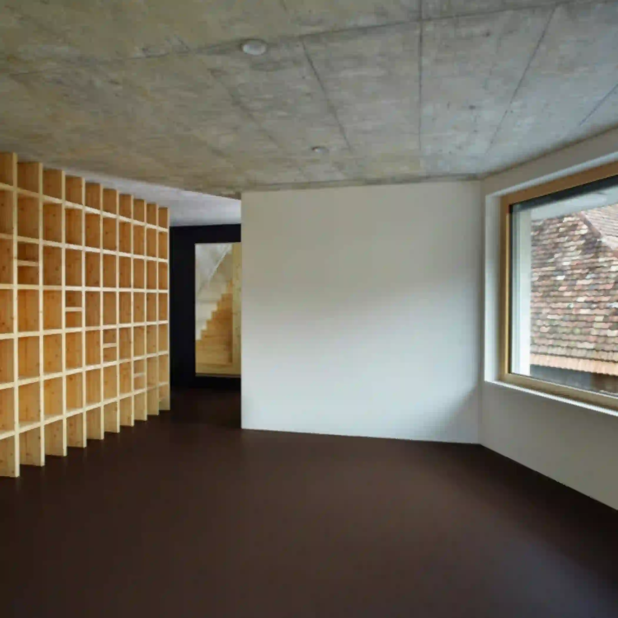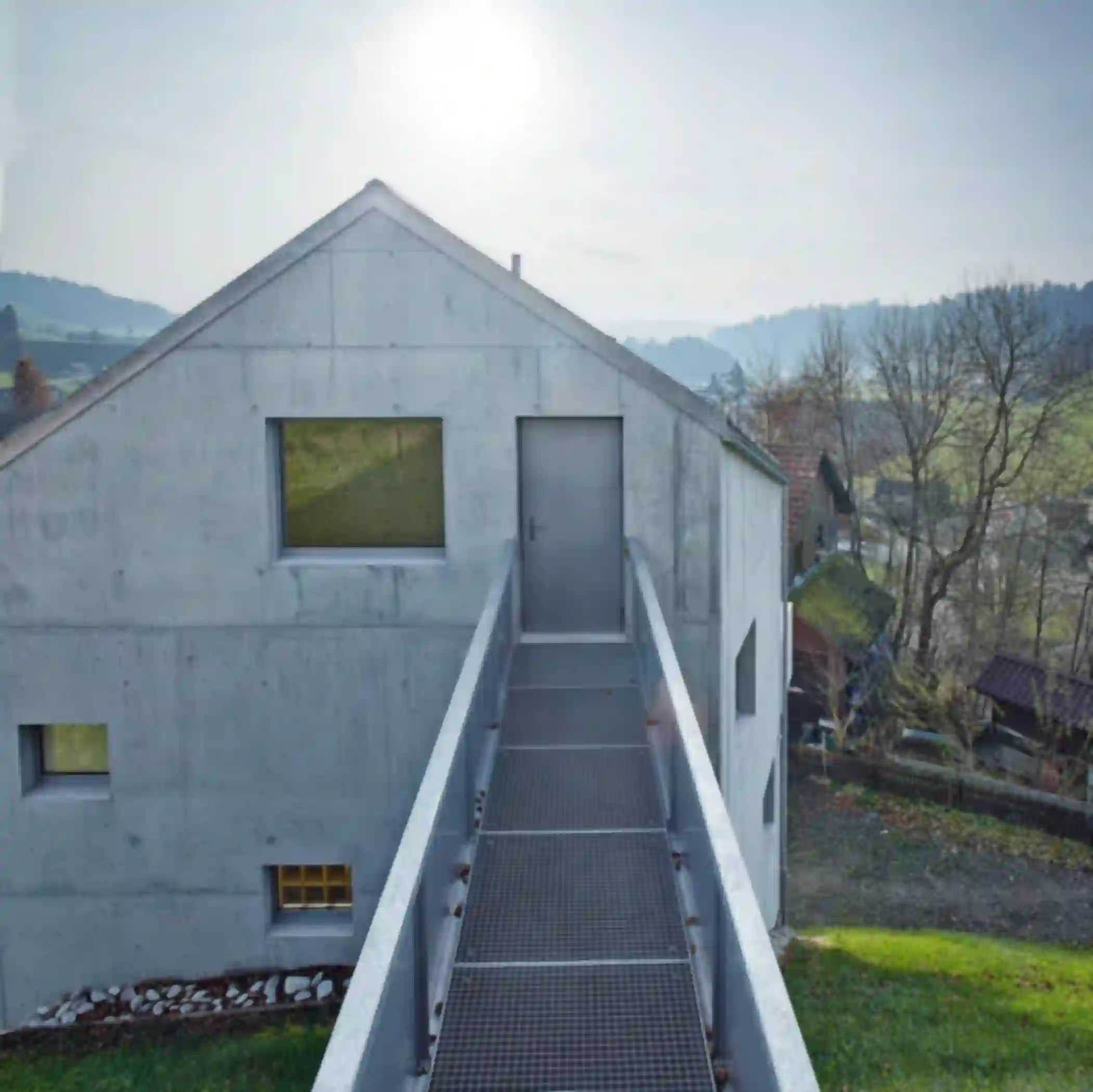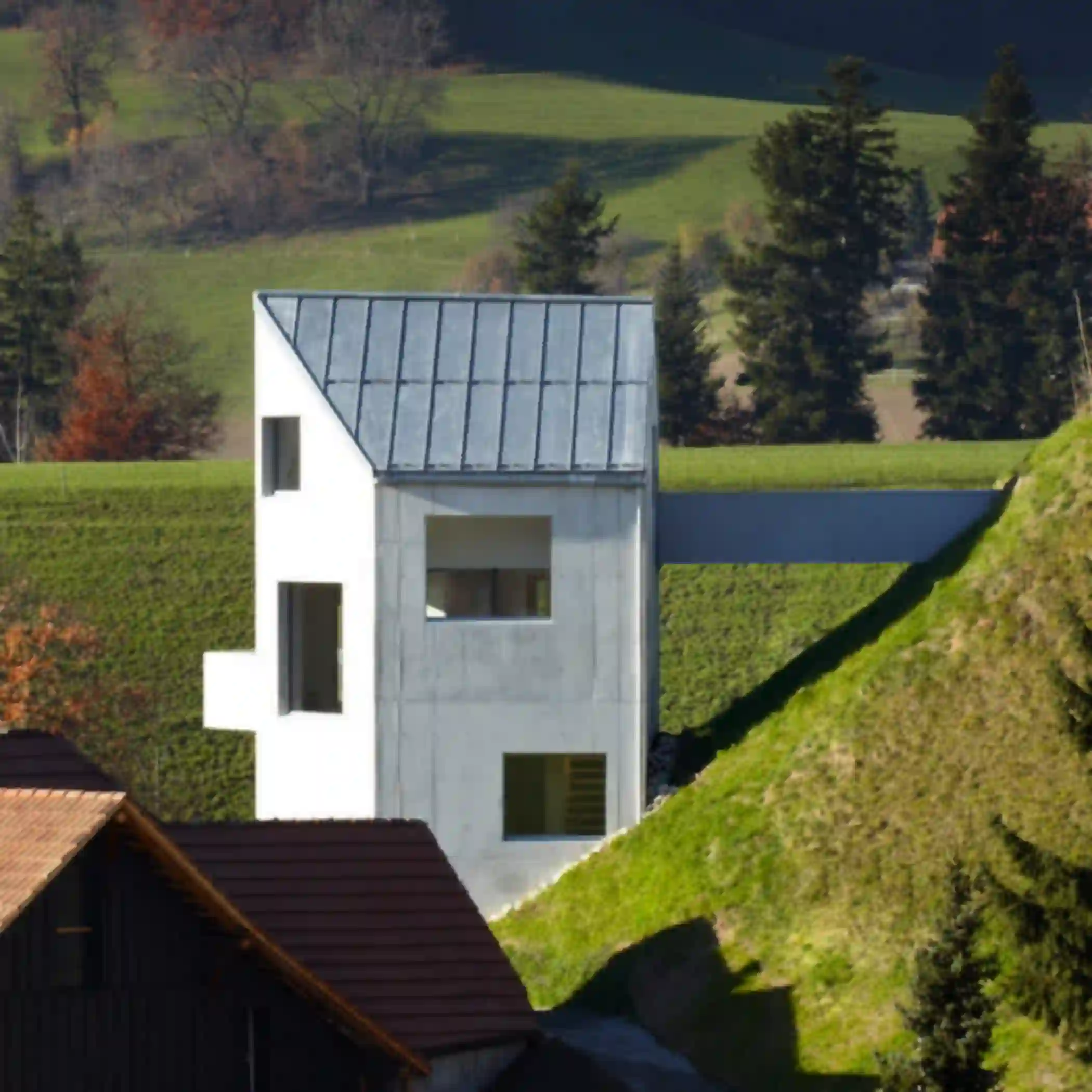 Auf einem begrenzten Baufeld von 70 qm entstand dank geschickter Lektüre des Baureglements ein Wohnhaus, dessen turmartige Erscheinung aus einem Hügel herauszuwachsen scheint. Vier Wohnebenen sind darin übereinander geschichtet, die über eine durchgehende Bibliothek und Treppe miteinander verwoben sind. Das Durchschreiten der Etagen bietet dabei unterschiedliche Blickbeziehungen und verbindet sich dank umlaufender Fenster auf vielfältige Weise mit der landschaftlich geprägten Umgebung. Trotz der eigenständigen Erscheinung und klaren Materialisierung schreibt der Neubau die vorhande Formensprache fort und verbindet sich harmonisch mit dem von sattelbedachten Einzelbauten geprägten Ortsbild.