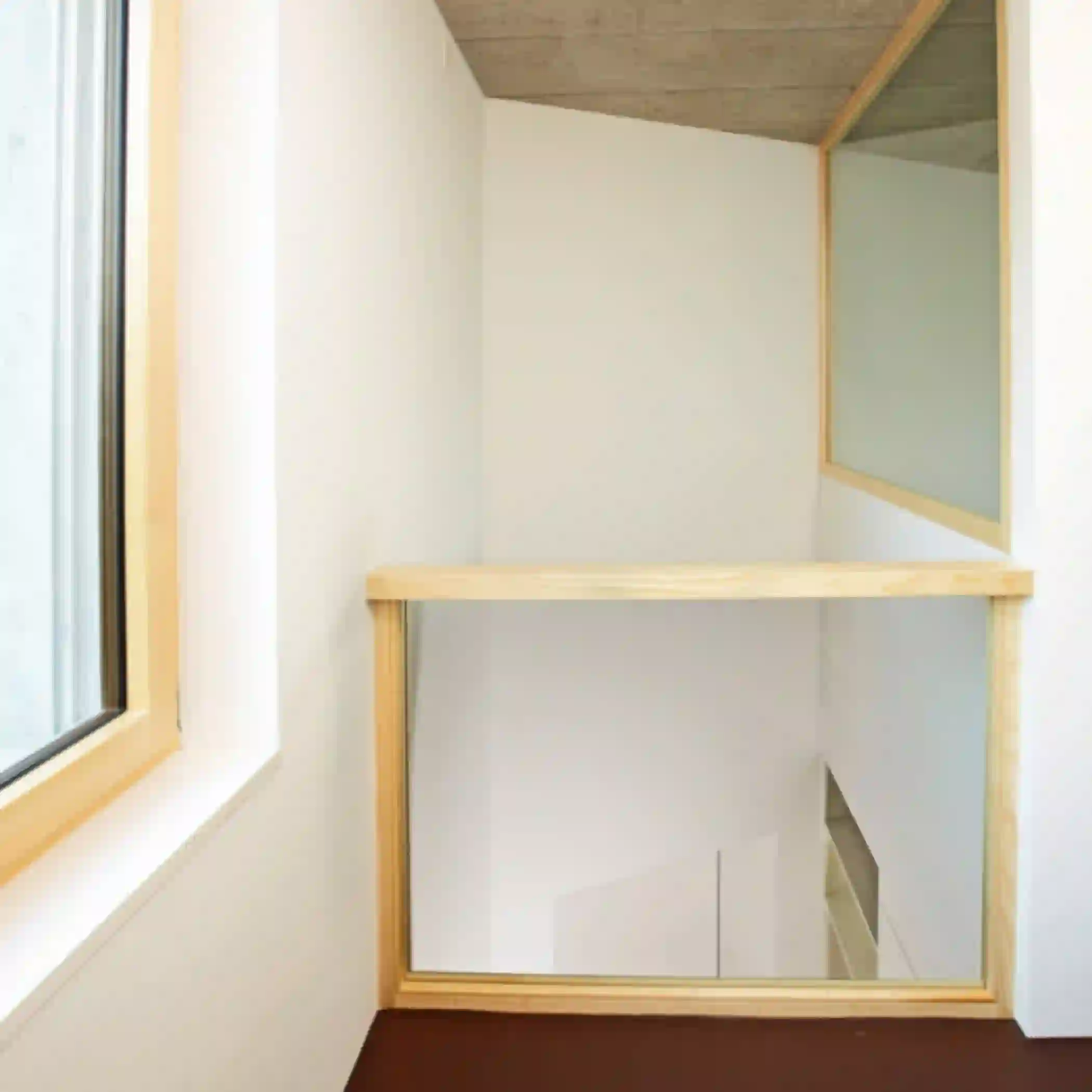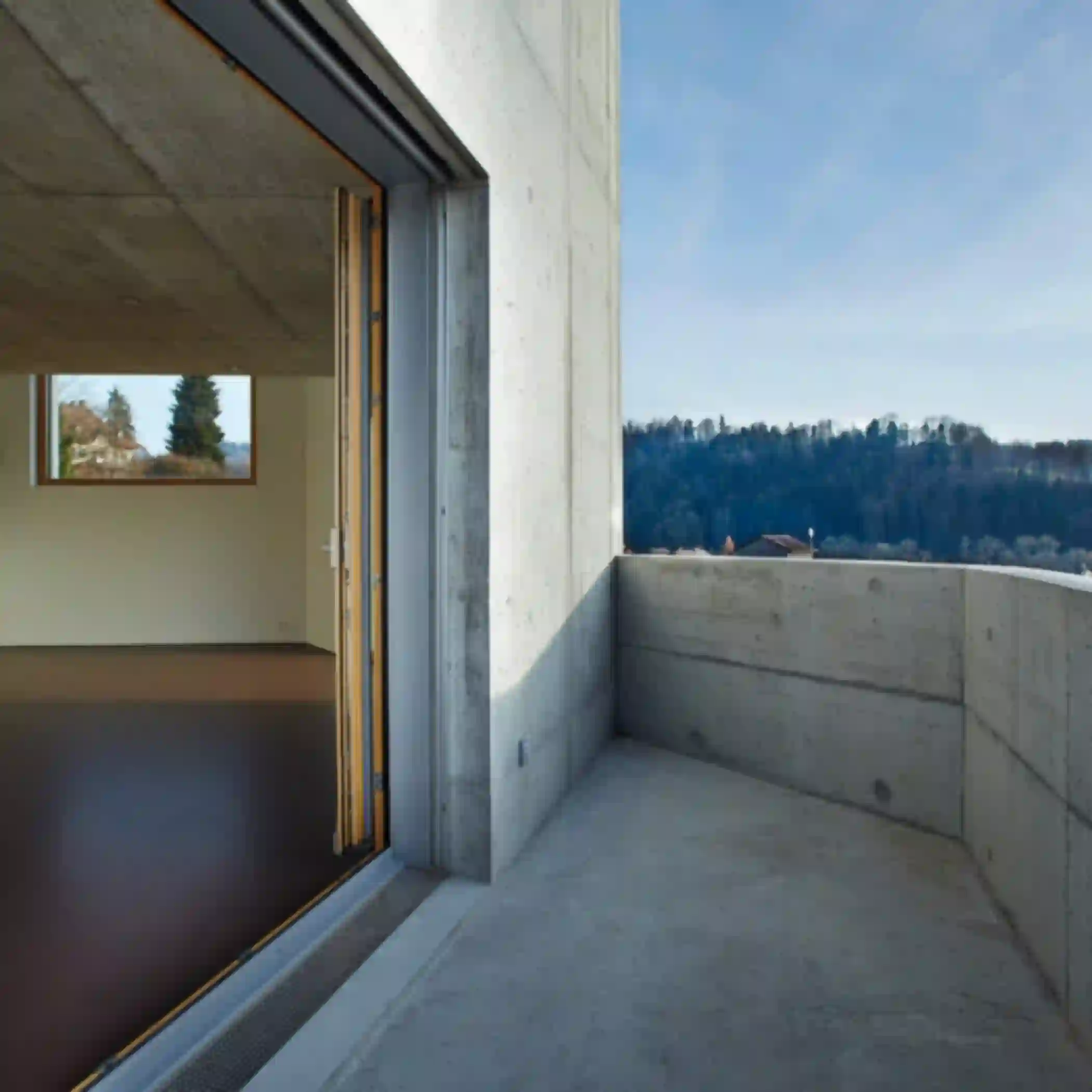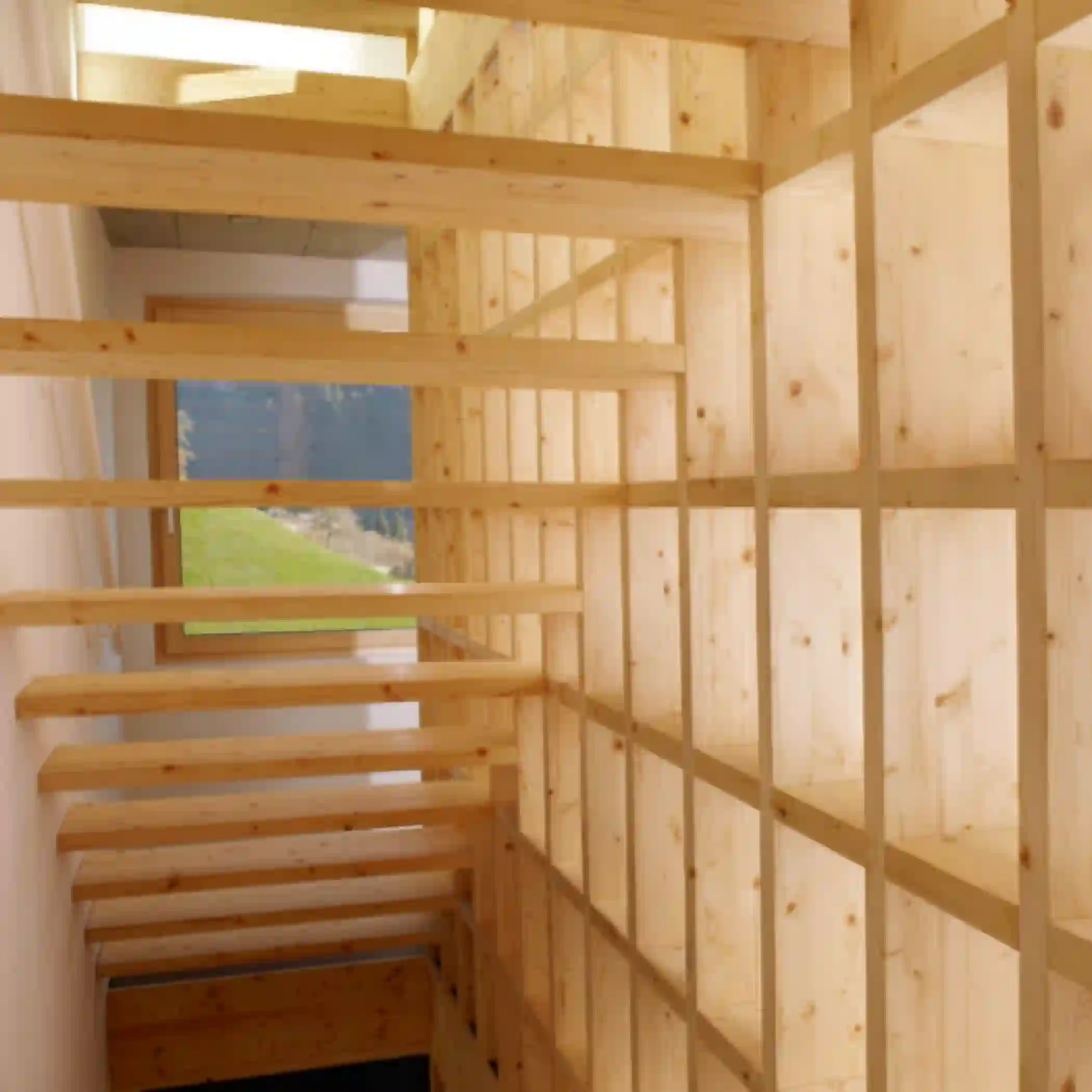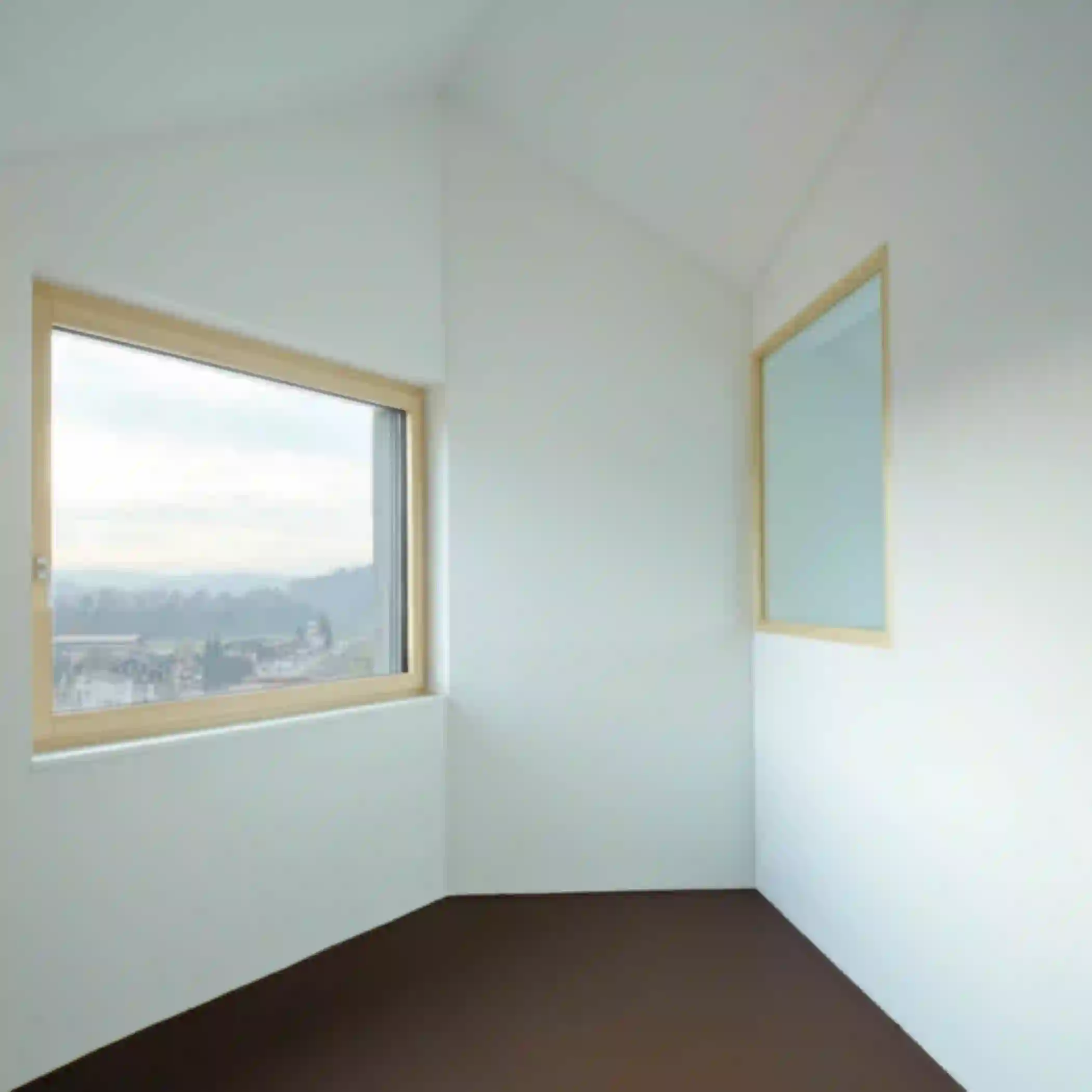 Auf einem begrenzten Baufeld von 70 qm entstand dank geschickter Lektüre des Baureglements ein Wohnhaus, dessen turmartige Erscheinung aus einem Hügel herauszuwachsen scheint. Vier Wohnebenen sind darin übereinander geschichtet, die über eine durchgehende Bibliothek und Treppe miteinander verwoben sind. Das Durchschreiten der Etagen bietet dabei unterschiedliche Blickbeziehungen und verbindet sich dank umlaufender Fenster auf vielfältige Weise mit der landschaftlich geprägten Umgebung. Trotz der eigenständigen Erscheinung und klaren Materialisierung schreibt der Neubau die vorhande Formensprache fort und verbindet sich harmonisch mit dem von sattelbedachten Einzelbauten geprägten Ortsbild.