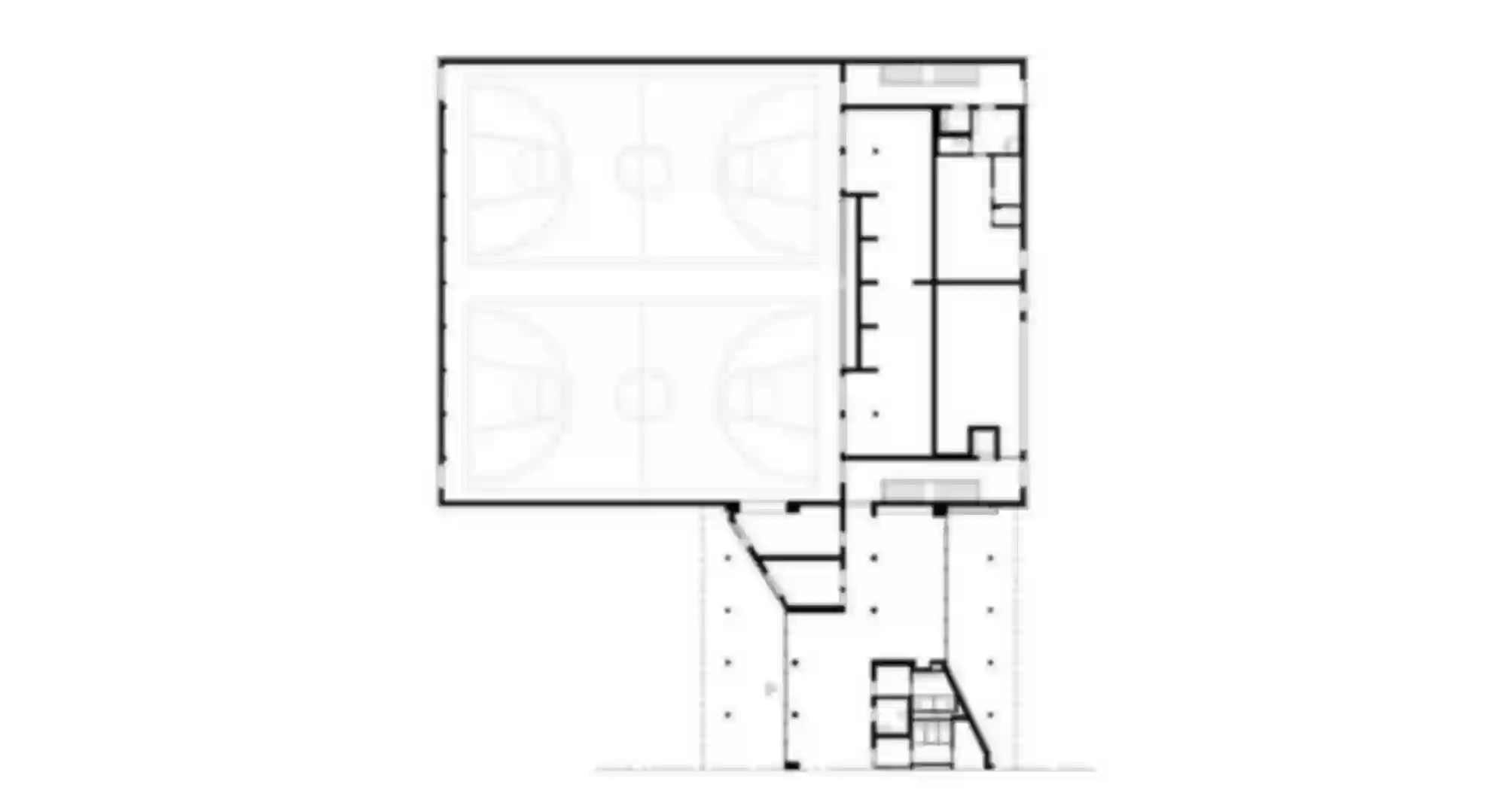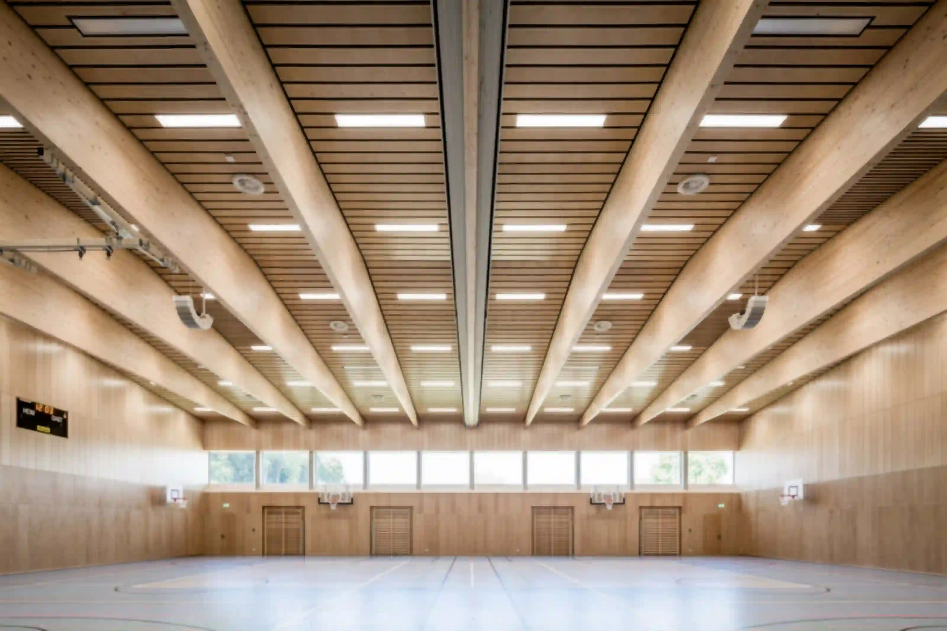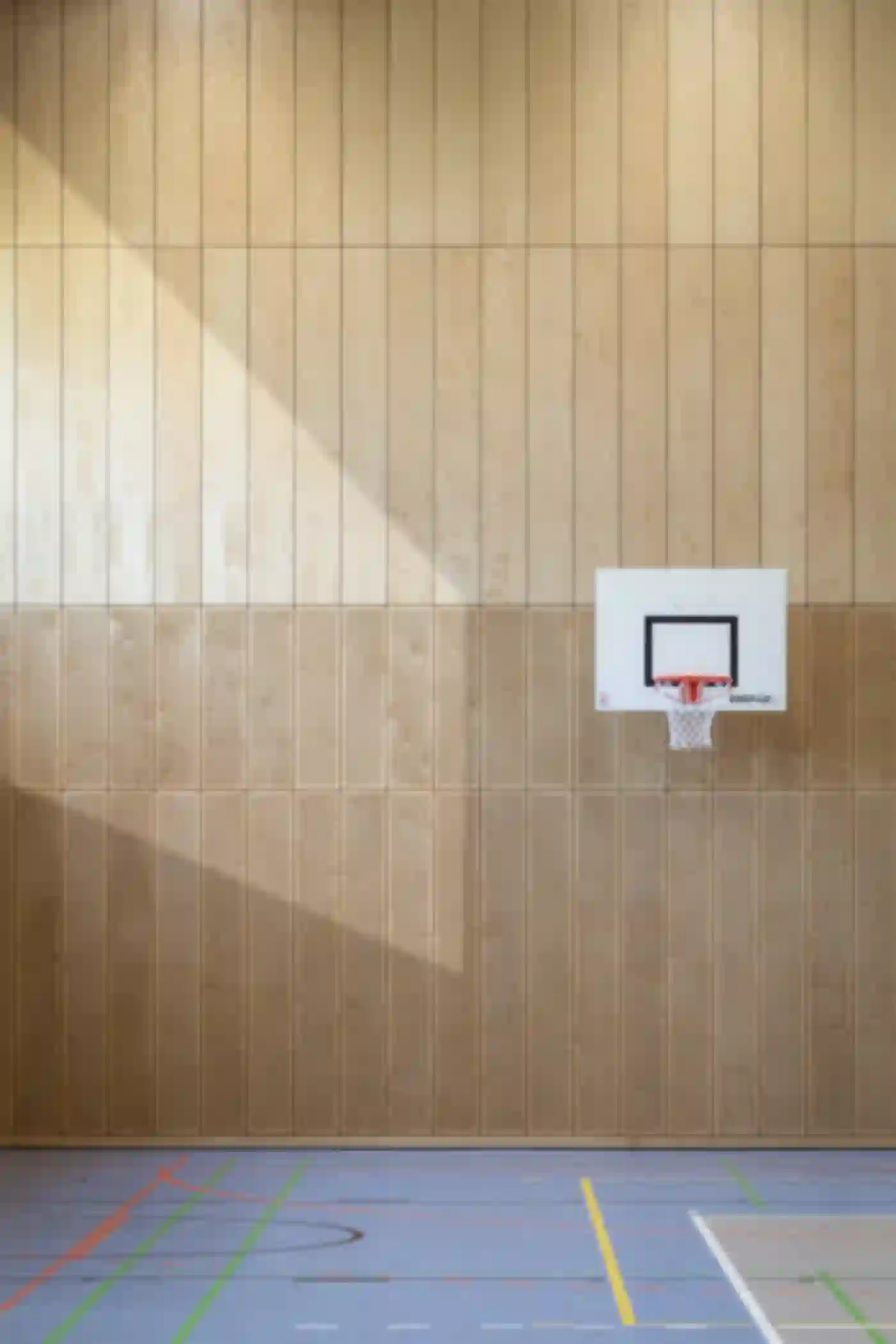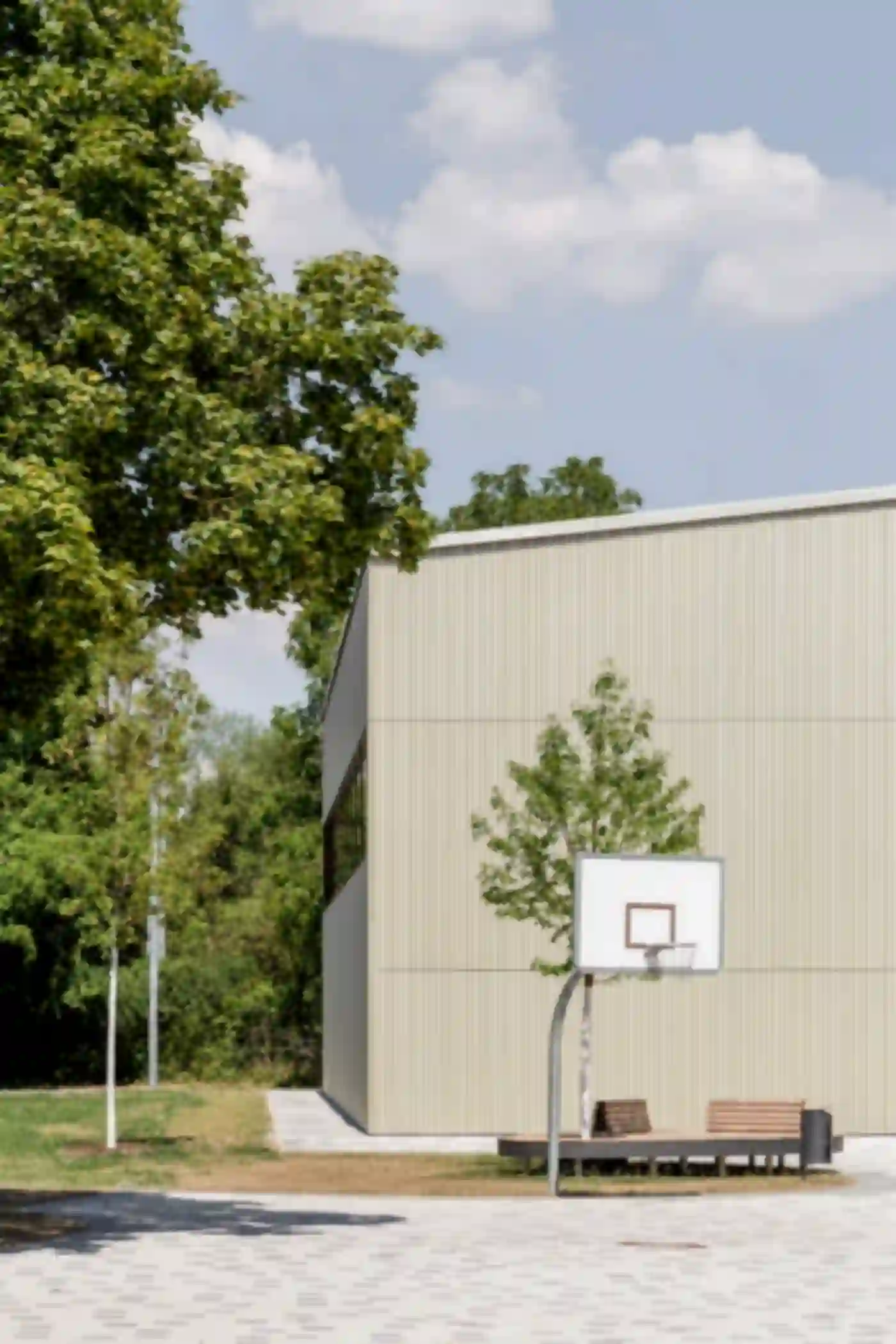 La nouvelle salle de sport double vient remplacer la salle de sport préexistante de l’ensemble scolaire de Niederviehbach. Le projet se glisse sur la parcelle entre les bâtiments découpés de l’école actuelle et ceux de l’école enfantine. Il se présente alors comme un volume indépendant mais étroitement lié au complexe scolaire existant. Le site bénéficie dorénavant d’un foyer commun, dont la fonction est double ; d’une part délimiter un seuil entre quartier et école, avec à l’est l’accès principal et à l’ouest l’accès au préau, et d’autre part relier l'école à la nouvelle salle de sport. La salle de sport en elle-même présente une organisation simple et compacte grâce notamment à la répartition des locaux secondaires sur deux niveaux. Un bardage doré en aluminium habille les façades alors qu’à l’intérieur le béton apparent, du bois clair et des couleurs discrètes dominent.