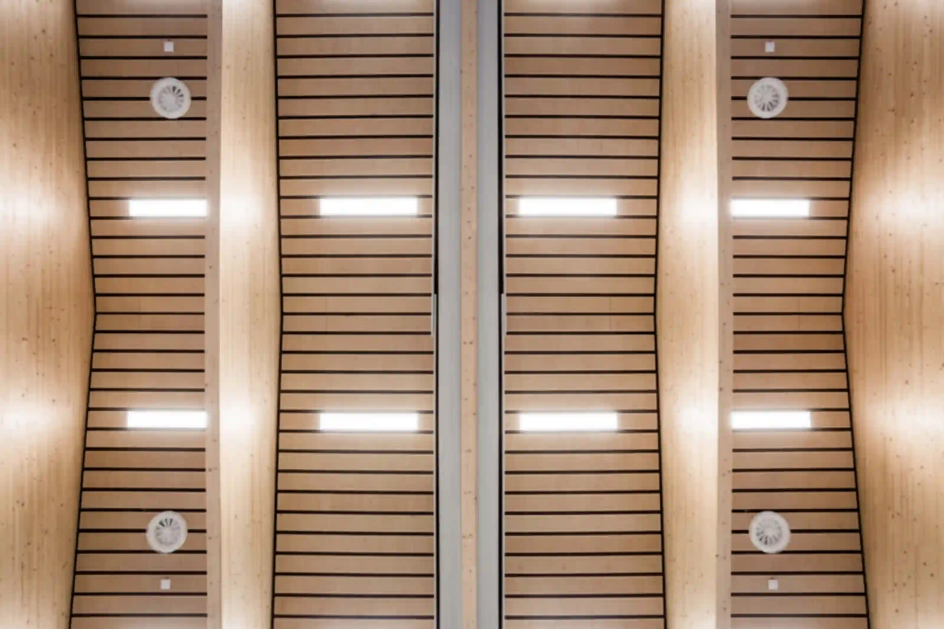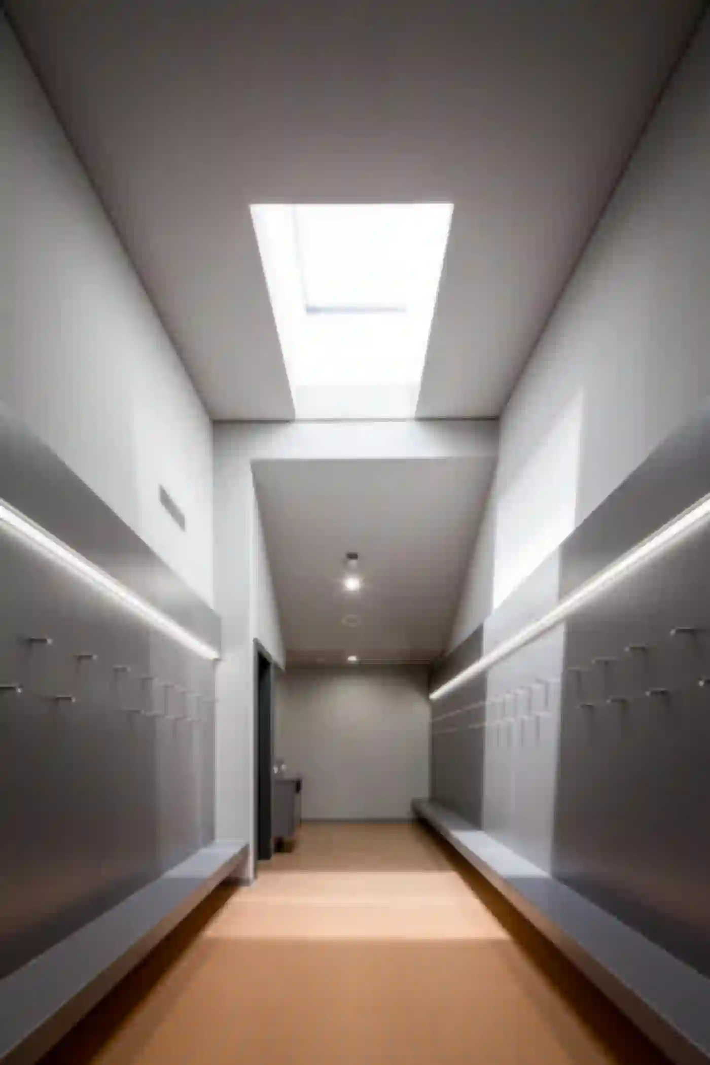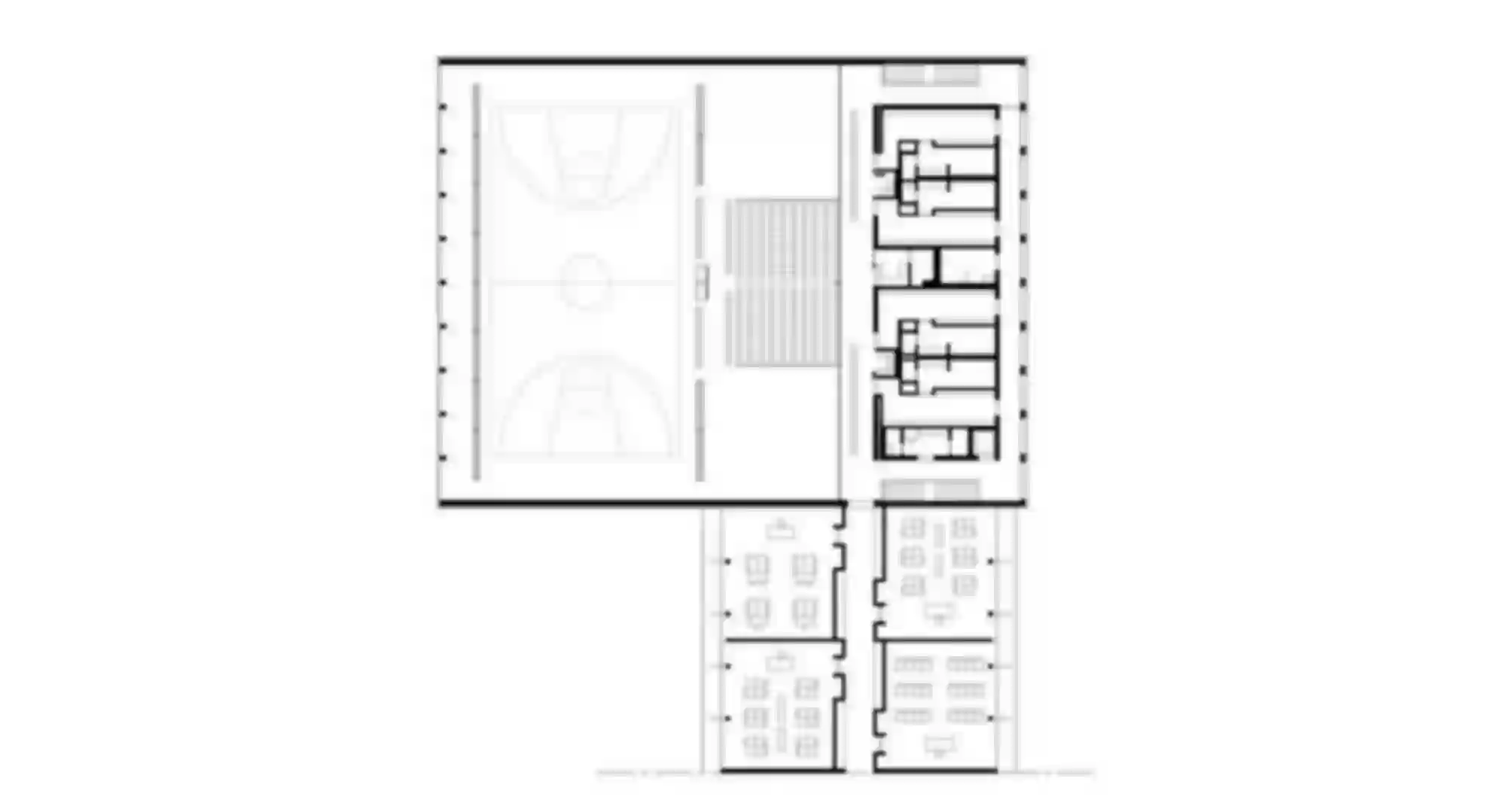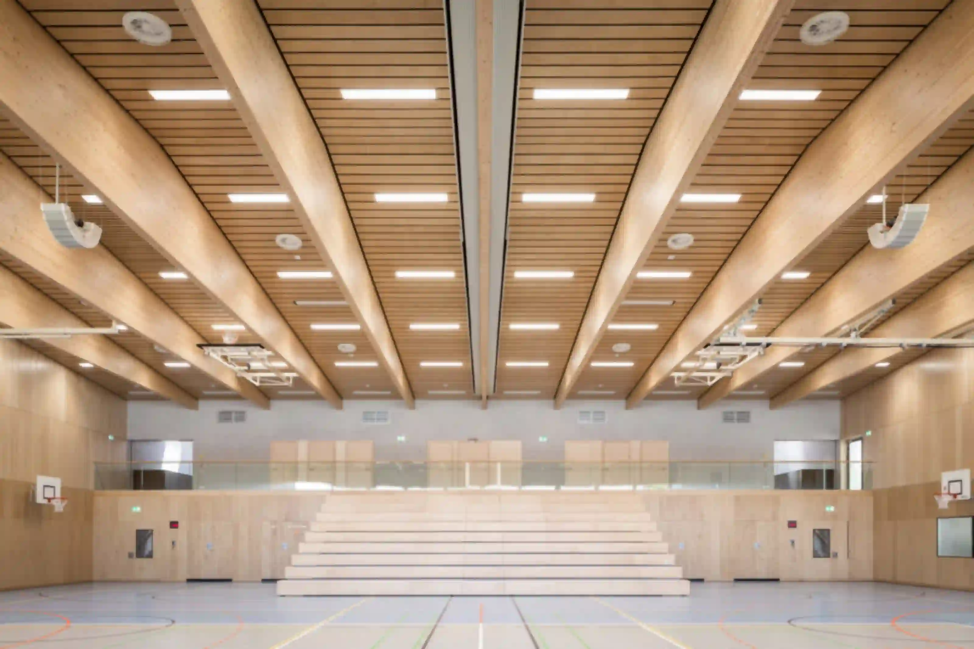 La nouvelle salle de sport double vient remplacer la salle de sport préexistante de l’ensemble scolaire de Niederviehbach. Le projet se glisse sur la parcelle entre les bâtiments découpés de l’école actuelle et ceux de l’école enfantine. Il se présente alors comme un volume indépendant mais étroitement lié au complexe scolaire existant. Le site bénéficie dorénavant d’un foyer commun, dont la fonction est double ; d’une part délimiter un seuil entre quartier et école, avec à l’est l’accès principal et à l’ouest l’accès au préau, et d’autre part relier l'école à la nouvelle salle de sport. La salle de sport en elle-même présente une organisation simple et compacte grâce notamment à la répartition des locaux secondaires sur deux niveaux. Un bardage doré en aluminium habille les façades alors qu’à l’intérieur le béton apparent, du bois clair et des couleurs discrètes dominent.