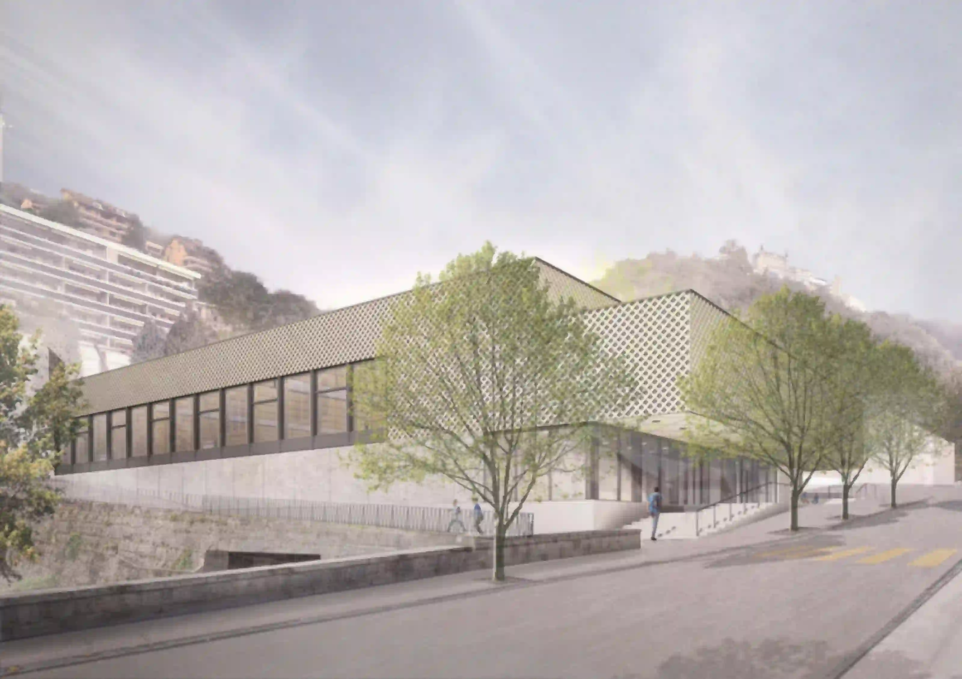 Die Schule Montreux Est liegt mitten im alten Ortskern von Montreux. Die bewegte Topographie gliedert das Schulareal in zwei Ebenen, auf deren oberem Niveau eine neue Sporthalle den baufälligen Bestandsbau ersetzen soll. Trotz seiner durch die Typologie gegebenen Grösse respektiert der Neubau die denkmalpflegerische Wertigkeit des Schulhauses sowie den Massstab der Umgebungsbebauung. Innerhalb des klar und einfach organisierten Gebäudes entstehen mittels geschickt gesetzter Öffnungen neue Spannungsfelder und Blickbezüge zur Umgebung. Die vorgeschlagene Fassade knüpft an die ortstypische Tradition der Holzverarbeitung an und stellt mit ihrer grafisch gekreuzten Lattung eine zeitgemässe Interpretation handwerklicher Ornamentik dar.